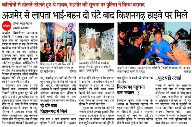 वैशालीनगर की अलखनंदा कॉलोनी निवासी सुनील कुमार की पुत्री सृष्टि (7) और पुत्र कार्तिक (4) 3 फरवरी की शाम न्यू हनुमान टेंट हाउस के पास घर के बाहर से संदिग्ध परिस्थितियों में लापता हो गए। परिजनों की सूचना पर पुलिस ने सर्च ऑपरेशन चलाया और बच्चों की तस्वीरें वायरलेस के जरिए प्रसारित की गईं। रात करीब सवा नौ बजे बच्चों के सकुशल मिलने की सूचना मिली।