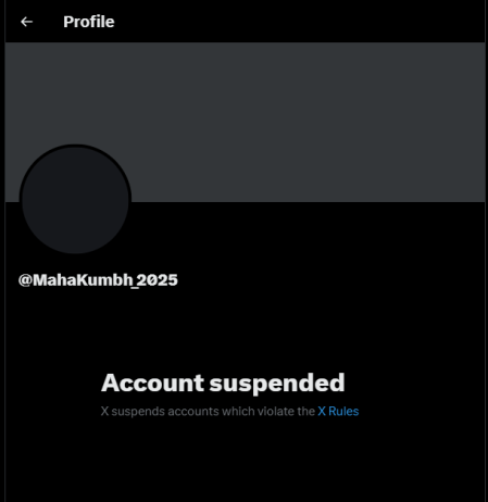 इस अकाउंट को आधिकारिक अकाउंट बताया गया, जिस पर अब तक 14200 फॉलोअर्स हैं। इस हैंडल से लगातार महाकुंभ संबंधी जानकारियां साझा की जा रही थीं। आपको बता दें कि यह अकाउंट कुंभ के ऑफिशियल वेबसाइट (https://kumbh.gov.in/)पर भी शेयर किया गया है। हालांकि, शुक्रवार दोपहर अचानक यह अकाउंट सस्पेंड कर दिया गया। हैंडल सर्च करते ही 'अकाउंट सस्पेंडेड' का मैसेज स्क्रीन पर दिखाई दे रहा है।