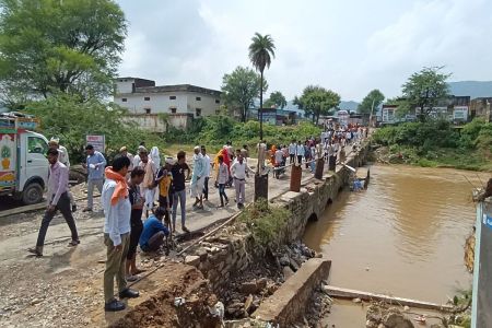 अलवर जिले में सरिस्का की वादियों में हुई जोरदार बारिश के बाद रूपारेल नदी में पानी की जबरदस्त आवक हुई है। तेज बहाव के चलते नदी का जलस्तर बढ़ गया और भर्तृहरि की पुलिया क्षतिग्रस्त हो गई। पुलिया के पास भारी भीड़ को देखते हुए प्रशासन ने सुरक्षा के कड़े इंतजाम किए हैं।
