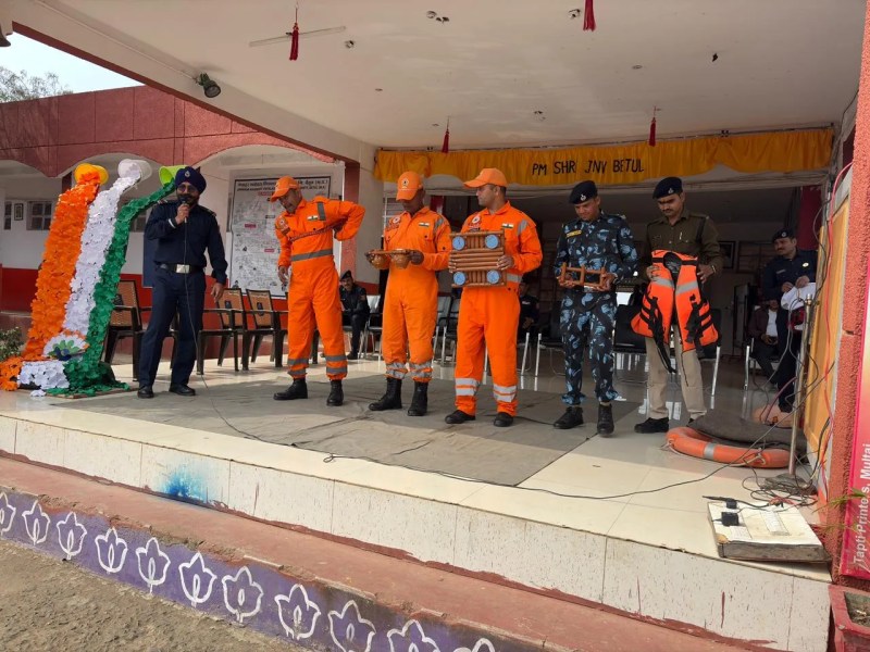 बैतूल। जिले में संभावित आपदाओं से निपटने की तैयारी को परखने और आमजन को रेस्क्यू प्रक्रिया से रूबरू कराने के उद्देश्य से बुधवार को जवाहर नवोदय विद्यालय प्रभातपट्टन एवं संदीपनी विद्यालय मुलताईं में एनडीआरएफ एवं एसडीईआरएफ की संयुक्त टीम द्वारा फेमेक्स के अंतर्गत रेस्क्यू अभियान आधारित जागरूकता एवं प्रशिक्षण कार्यक्रम आयोजित किया गया। कार्यक्रम के दौरान रेस्क्यू टीमों ने स्कूल परिसर में वास्तविक परिस्थितियों जैसी लाइव मॉक ड्रिल के माध्यम से आपदा के समय बचाव कार्यों का प्रदर्शन किया। बाढ़ की स्थिति में फंसे लोगों को सुरक्षित बाहर निकालने, भूकंप के दौरान घायल व्यक्तियों के रेस्क्यू, आग लगने की स्थिति में त्वरित निकासी और प्राथमिक उपचार की प्रक्रिया को व्यवहारिक रूप से समझाया गया।