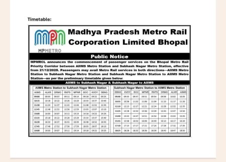भोपाल मेट्रो की ऑरेंज लाइन के प्रोयरिटी कॉरिडोर सुभाष नगर से एम्स तक 6.22 किलोमीटर की शुरुआत हो रही है। जिसमें सुभाष नगर, केंद्रीय स्कूल, डीबी मॉल, एमपी नगर, रानी कमलापति, डीआरएम ऑफिस, अलकापुरी और एम्स शामिल हैं। पहली ट्रेन की शुरुआत सुबह 9 बजे एम्स स्टेशन से शुरु होगी और आखिरी मेट्रो स्टेशन यानी सुभाष नगर 6.25 बजे पहुंच जाएगी।