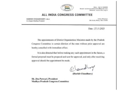 AICC की तरफ से मध्यप्रदेश के प्रभारी हरीश चौधरी ने जीतू पटवारी को इस संबंध में पत्र भी लिखा है। जिसमें उन्होंने कहा है कि प्रदेश कांग्रेस में अब कोई भी नियुक्ति उनकी लिखित अनुमति के बगैर मान्य नहीं होगी। उनके इस सख्त रुख से पार्टी दफ्तर में हड़कंप मच गया है। एआईसीसी की ओर से मध्यप्रदेश के प्रभारी हरीश चौधरी ने सीनियर नेताओं के साथ बैठक भी की। इसमें संजय कामले, अवनीश भार्गव, शिवी चौहान, रीना बौरासी, यश घनघोरिया और आशुतोष चौकसे मौजूद थे। बताया जा रहा है कि उन्होंने सभी को फटकार लगाई और कार्यकर्ताओं को एक जुट होकर काम करने की नसीहत भी दी। वे बैठक में भी कांग्रेस की गतिविधियों से नाराज नजर आए।