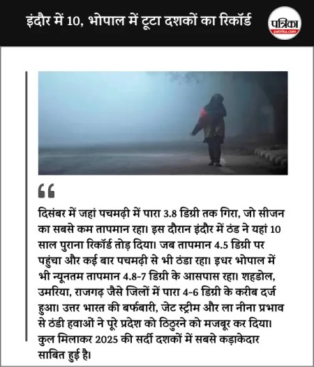 दिसंबर में जहां पचमढ़ी में पारा 3.8 डिग्री तक गिरा, जो सीजन का सबसे कम तापमान रहा। इस दौरान इंदौर में ठंड ने यहां 10 साल पुराना रिकॉर्ड तोड़ दिया। जब तापमान 4.5 डिग्री पर पहुंचा और कई बार पचमढ़ी से भी ठंडा रहा। इधर भोपाल में भी न्यूनतम तापमान 4.8-7 डिग्री के आसपास रहा। शहडोल, उमरिया, राजगढ़ जैसे जिलों में पारा 4-6 डिग्री के करीब दर्ज हुआ।