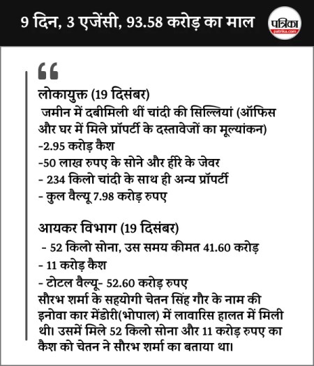 प्रवर्तन निदेशालय (ED) ने 27 दिसंबर को सौरभ शर्मा और उसके सहयोगी चेतन सिंह गौर, शरद जायसवाल, रोहित तिवारी के ठिकानों पर भी छापामारी की थी। सौरभ के परिजन और दोस्तों के खातों में 4 करोड़ का बैंक बैलेंस मिला। इसके अलावा 23 करोड़ की संपत्ति भी ED ने जांच के दायरे में ली थी।