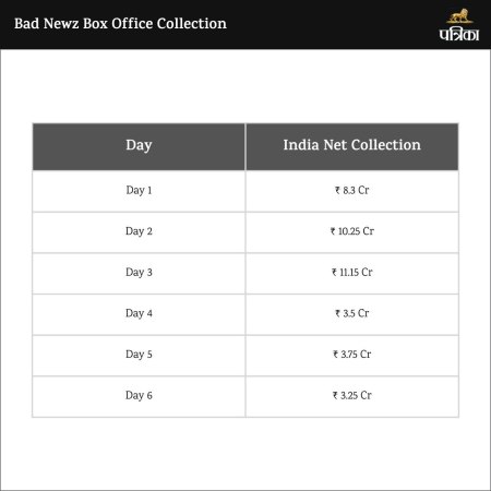 सैकनिल्क की अर्ली ट्रेंड रिपोर्ट के मुताबिक, फिल्म ‘बैड न्यूज’ ने रिलीज के छठे दिन यानी पहले बुधवार को 3.25 करोड़ रुपए की कमाई की है। इसी के साथ ‘बैड न्यूज’ का 6 दिनों का कुल कलेक्शन अब 40.20 करोड़ रुपए हो गया है।