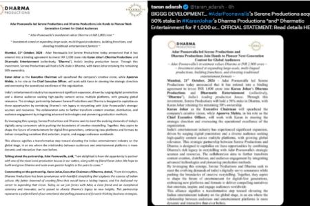 Dharma Production: करण जौहर की कंपनी धर्मा प्रोडक्शंस में 50 प्रतिशत की हिस्सेदारी अदार पूनावाला की सेरेन प्रोडक्शंस खरीदने जा रही है। इसकी जानकारी आज यानी 21 अक्टूबर को कंपनी ने खुद दी है। बताया जा रहा है कि यह डील 1,000 करोड़ रुपए में होगी। इस डील को लेकर करण जौहर और अदार पूनावाला ने खुशी जाहिर की है।