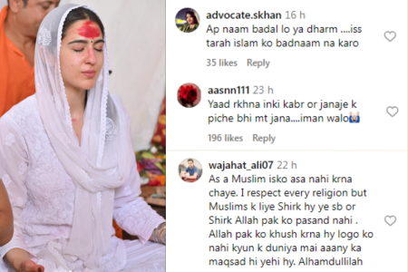 सोशल मीडिया पर उनकी मंदिर यात्रा की तस्वीरें और वीडियो तेजी से वायरल हो रहे हैं। एक विशेष समुदाय के लोग एक्ट्रेस पर भड़क गए हैं। वायरल हो रहे तस्वीर के कमेंट सेक्शन में एक यूजर ने लिखा, “एक मुसलमान के रूप में इसको ऐसा नहीं करना चाहिए। मैं हर धर्म का सम्मान करता हूं लेकिन मुसलमानों के लिए शिर्क है ये सब या शिर्क अल्लाह पाक को पसंद नहीं। अल्लाह पाक को खुश रखना लोगो को नहीं क्योंकि दुनिया में आने का मकसद ही यही है।”