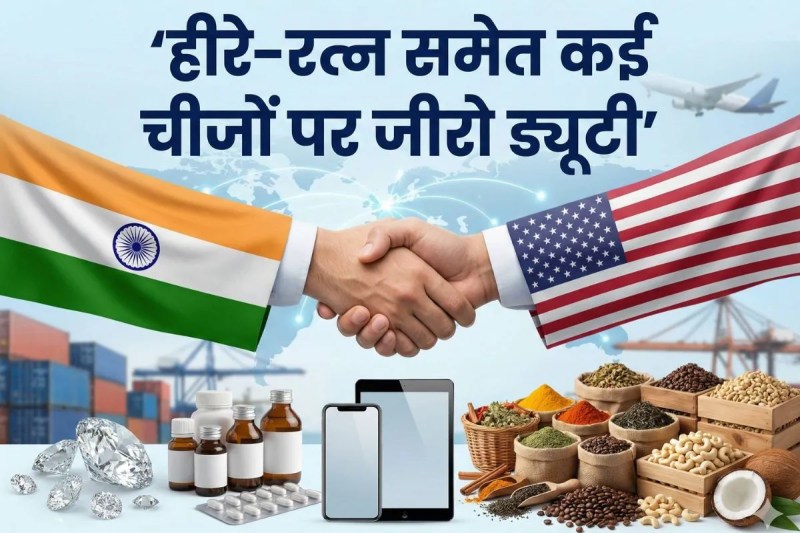 भारत-अमेरिका व्यापार समझौते की घोषणा में बताया कि रत्न, हीरे, फार्मा और कृषि उत्पादों पर जीरो ड्यूटी लागू होगी। इससे भारतीय निर्यातकों, किसानों और उद्योगों को अमेरिकी बाजार में बड़ा लाभ मिलने की उम्मीद है।
