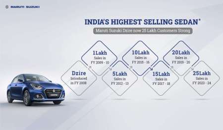 मारुति सुजुकी ने डिजायर को साल 2008 में सबसे पहले लॉन्च किया था, इसके बाद FY 2009-10 में डिजायर ने 1 लाख की बिक्री पार की, वहीं 5 लाख की बिक्री FY 2012-13 में डिजायर ने क्रॉस कर दी थी। कार की बिक्री तेजी से आगे बढ़ रही थी, 10 लाख कारों की बिक्री FY 2015-16 में हो गई थी। इसके बाद FY 2017-18 में डिजायर की 15 लाख यूनिट्स की बिक्री हुई। FY 2019-20 में डिजायर की बिक्री 20 यूनिट के पार जा पहुंची। और अब FY2023-24 में इसने 25 लाख की बिक्री का रिकॉर्ड बना लिया।