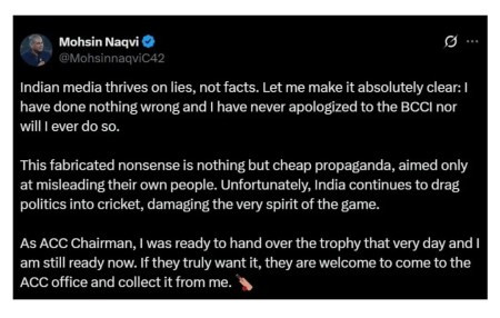 मोहसिन नकवी ने भारतीय मीडिया को निशाने पर लेते हुए उन तमाम खबरों को मनगढ़ंत और प्रोपेगेंडा करार दिया। उन्होंने सोशल मीडिया एक्स पर लिखा, ''भारतीय मीडिया झूठ पर फलता-फूलता है, तथ्यों पर नहीं। मैं बिलकुल स्पष्ट कर दूं कि मैंने कुछ भी गलत नहीं किया है। मैंने बीसीसीआई से कभी माफी नहीं मांगी है और न ही मांगूंगा।''