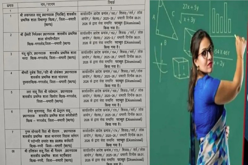 प्रधानपाठक लखनलाल साहू विश्रामपुर प्राथमिक शाला, प्रधानपाठिका ईश्वरी निर्मलकर प्राथमिक शाला सोनारिन दैहान मगरलोड, प्रधानपाठिका मंजू खुंटेर भरदा प्राथमिक शाला, युकेश दुधवारा प्राथमिक शाला भाठापारा, प्रधानपाठिका लता साहू खिसोरा प्राथमिक शाला, प्रधानपाठक हेमंत साहू करेली छोटी प्राथमिक शाला, प्रधानपाठिका पूनम सोनवानी प्राथमिक शाला थानापारा सिहावा (नगरी), प्रधानपाठक हरिशंकर नगरी ब्लाक पर बर्खास्तगी की साहू चटर्टीबाहरा प्राथमिक शाला गाज गिरी है।