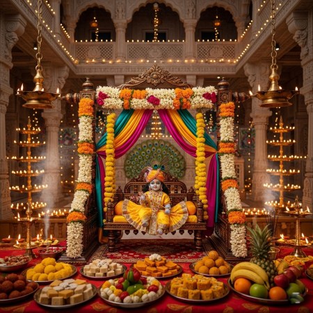 इस मन्त्र से पूजन करता हुआ सुसज्जित करके भगवान् को सुन्दर सजे हुए हिंडोले में प्रतिष्ठित करें। अन्नरहित नैवेद्य तथा सुस्वादु मिष्टान्न. नमकीन पदार्थों, फल, पुष्पों और नारियल, छुहारे, अनार, पंजीरी, नारियल के मिष्टान्न तथा नाना प्रकार के मेवे का प्रसाद सजाकर श्रीभगवान् को अर्पण करे। पूजन में देवकी, वसुदेव, वासुदेव, बलदेव, नन्द, यशोदा और लक्ष्मी-इन सबका क्रमशः नाम निर्दिष्ट करना चाहिये।
