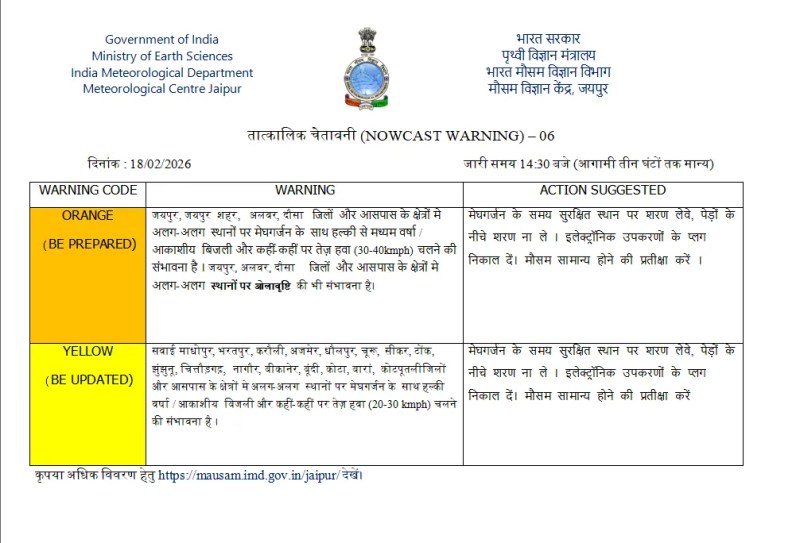 Jaipur: The weather in Rajasthan has taken a sudden turn. The Meteorological Centre Jaipur of the India Meteorological Department issued an immediate warning on February 18, forecasting thunderstorms, lightning, and rain in several districts. The department has implemented Orange and Yellow alerts for the next few hours.