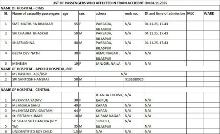 Devkumar Dhuri, a passenger from Taktpur, stated that he was travelling by train from Kotmisunar to Bilaspur. Suddenly, there was a loud jolt in the train near Gatoura. Peeking outside, he saw the engine had climbed on top of the goods train's coach. Panicked, we jumped out with our belongings and helped pull out those trapped. 20 to 25 people were injured in the accident.