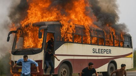 A private bus caught fire this morning in the Chitradurga district of Karnataka. It is feared that 10 people have died in this accident. The bus was going from Bengaluru to Shivamogga when it collided with a lorry on NH-48. Karnataka Police reached the spot after receiving information about the incident. The injured have been admitted to the hospital.