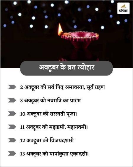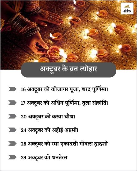 Vrat Tyohar List October 2024: अक्टूबर 2024 का महीना बेहद खास है, इसमें हिंदी कैलेंडर के अश्विन और कार्तिक महीने पड़ेंगें। इसके साथ ही नवरात्रि, करवाचौथ तक बड़े व्रत त्योहार पड़ने वाले हैं। इसी के साथ अक्टूबर में ही धनतेरस से दीपोत्सव की शुरुआत हो जाएगी, जो नवंबर में दीपावली और गोवर्धन पूजा के साथ संपन्न होगी। देखें अक्टूबर 2024 के प्रमुख व्रत और त्योहार …