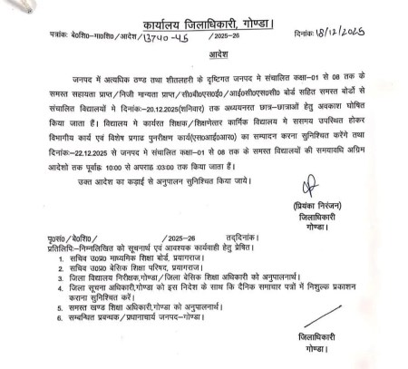 डीएम प्रियंका निरंजन ने कड़ाके की ठंड को देखते हुए जहां दो दिनों के लिए कक्षा 1 से 8 तक विद्यालय बंद कर दिया है वही स्कूल की टाइमिंग में भी चेंज किया गया है। 22 दिसंबर से स्कूल के समय में परिवर्तन किया गया है अब कक्षा एक से आठ तक स्कूल की कक्षाएं 10 बजे से 3 बजे तक चलेगी। अवकाश के दिनों में भी केवल बच्चों के लिए छुट्टी की गई है। शिक्षक और शिक्षणेत्तर कर्मचारी समय से विद्यालय में पहुंचकर विशेष मतदाता पुनरीक्षण कार्यक्रम तथा विभागीय कामकाज करेंगे।