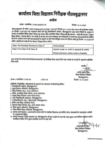 Gautam Buddh Nagar school news दिल्ली एनसीआर सहित गौतम बुद्ध नगर में एयर क्वालिटी इंडेक्स 400 से अधिक दर्ज किया गया है। जिसे गंभीर श्रेणी में रखा गया है। गौतम बुद्ध नगर प्रशासन ने एयर क्वालिटी इंडेक्स की खराब स्थिति को देखते हुए GRAP लागू कर दिया है। जिसके अनुसार कक्षा 5 तक के लिए ऑनलाइन क्लासेस और 6 से 9-10 तक के लिए फिजिकल और ऑनलाइन दोनों मोड में क्लास लगाई जाएं। आदेश का पालन कड़ाई से करने के निर्देश दिए गए हैं। यह आदेश आज 15 दिसंबर से अगले आदेशों तक लागू रहेगा। कक्षा 5 तक की पढ़ाई को पूरी तरह ऑनलाइन कर दिया है। यह आदेश सभी बोर्ड पर लागू है।