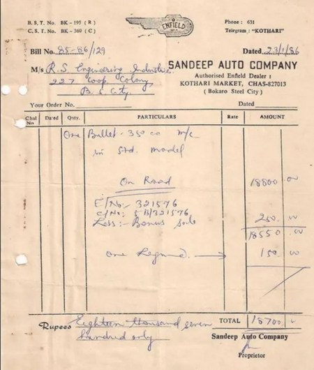रॉयल एनफील्ड बुलेट 350 की 1986 में कीमत जानकार आप हैरान रह जाएंगे। इस शानदार मोटरसाइकिल की आज से 38 साल पहले कीमत सिर्फ 18,700 रुपये थी। जी हाँ, यह लोकप्रिय मोटरसाइकिल आज से 38 साल पहले काफी सस्ती आती थी। और इसकी कीमत का प्रमाण देने के लिए इसके पुराने बिल को देखा जा सकता है, जिसमें 1986 में इसकी कीमत साफ तौर पर देखी जा सकती है। यह बिल झारखंड के बोकारो स्टील सिटी शहर का है, जहाँ के अधिकृत रॉयल एनफील्ड डीलर संदीप ऑटो कंपनी ने यह बिल जारी किया था। इस बिल में लिखी तारीख से पता चलता है कि 23 जनवरी, 1986 को यह मोटरसाइकिल 18,700 रुपये में बिकी थी।