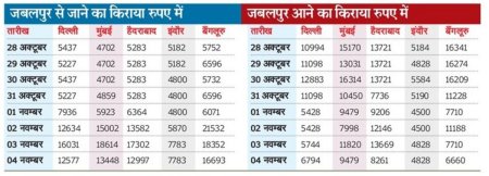 सबसे कम फेयर जबलपुर-जगदलपुर-जबलपुर का है। यह विमान सेवा सप्ताह में दो दिन बुधवार और शुक्रवार को है। इस रूट पर लायर्स का ग्राफ भी कम रहता है, इसलिए यहां का फेयर सामान्य दिनों के बराबर ही है। बंद की उड़ानजबलपुर और पुणे के बीच कुछ साल पहले लाइट शुरू की गई थी। यह लाइट हमेशा फुल रहती थी। इस लाइट के शुरू हो जाने के बाद पुणे आना-जाना आसान हो गया था। लेकिन इस लाइट को भी बंद कर दिया गया। इससे शहर की पुणे से कनेक्टिविटी टूट गई। स्पाइस जेट ने जबलपुर-मुंबई-जबलपुर रूट पर चलने वाली अपनी साप्ताहिक उड़ान भी बंद कर दी है। इस कारण भी फेयर बढ़ा है।
