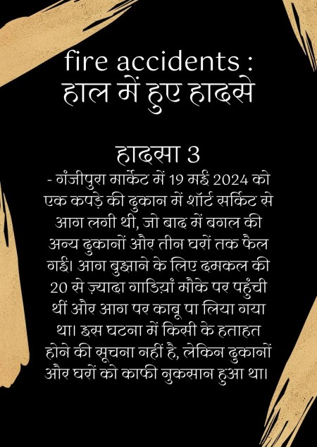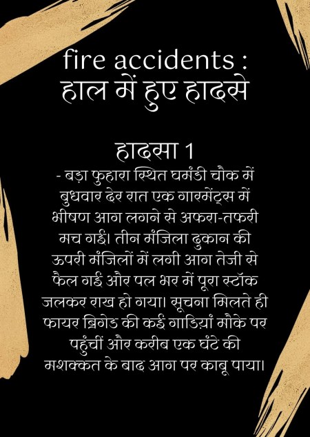 fire accidents : शहर में आए दिन हो रहे अग्नि हादसों के बाद भी जिम्मेदार नहीं चेत रहे हैं। कोई भी अग्नि दुर्घटना होने के बाद कुछ दिनों तक वे कागजी खानापूर्ति में जुट जाते हैं और उसके बाद फिर दूसरे हादसे के इंतजार में कार्रवाई ठप्प हो जाती है। पिछले चार दिनों में दो बड़े हादसे होने के बाद एक बार फिर नगर निगम के जिम्मेदार अधिकारियों की पोल खुल गई है। शहर की तंग गलियों में धड़ल्ले से कारखाने, फैक्ट्रियां संचालित हो रही हैं। जबकि इन गलियों में दो पहिया वाहन बमुश्किल गुजर पाते हैं।