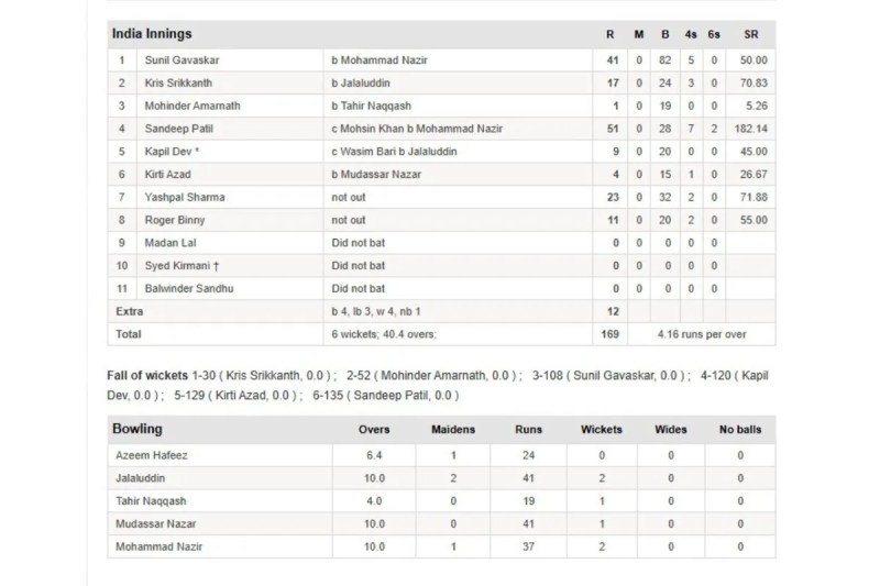 स्कोर: पूरी पाकिस्तानी टीम 46 ओवरों में 9 विकेट खोकर केवल 166 रन ही बना सकी। जहीर अब्बास (48 रन) के अलावा कोई भी बल्लेबाज टिक कर नहीं खेल सका।