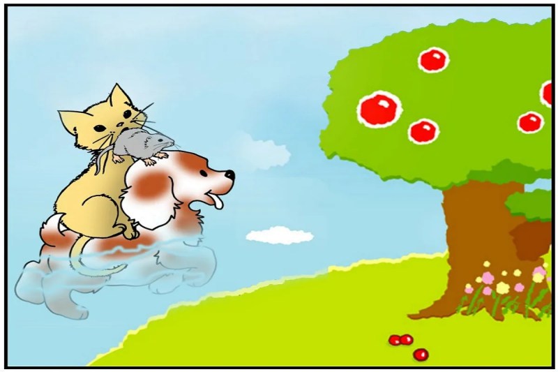 कुत्ता, बिल्ली और चूहा सच्चे और पक्के मित्र थे। वह आपस में मिल-जुल कर रहते थे। एक दिन उन्हें बहुत भूख लग रही थी। उन्होंने नदी के उसे पार एक सेब का पेड़ देखा। लेकिन चूहा और बिल्ली को तैरना नहीं आता था। कुत्ते को तैरना आता था। इसलिए कुत्ते ने उन दोनों को अपनी पीठ पर बैठा कर नदी पार करा दी।बिल्ली ने पेड़ पर चढ़कर सेब नीचे गिरा दिए। फिर तीनों ने मिलकर मजे से सेब खा लिए।
