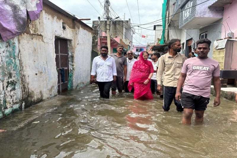 कोटा के देवली अरब रोड पर जल भराव क्षेत्र का दौरा करते हुए विधायक कल्पना देवी