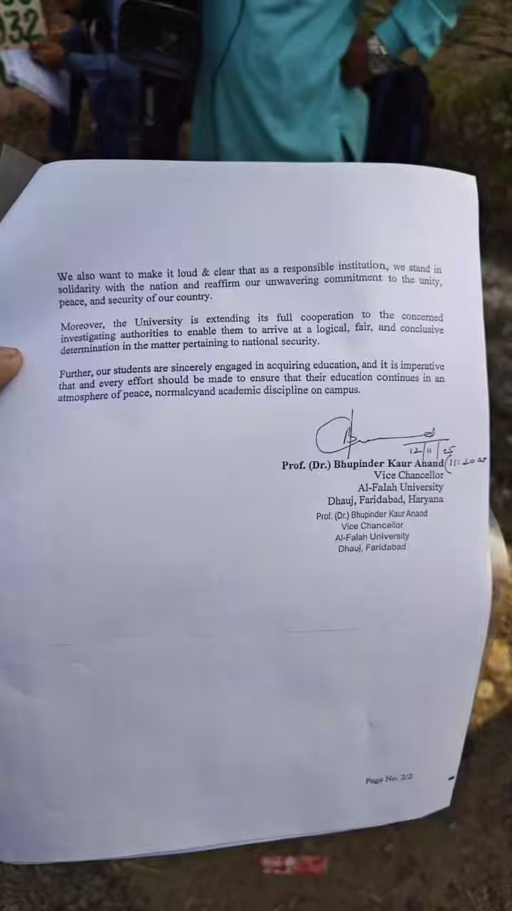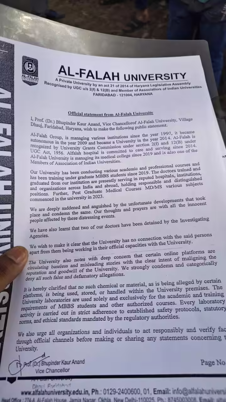 हरियाणा के फरीदाबाद की अल-फलाह यूनिवर्सिटी ने दिल्ली में लाल किले के पास हुए विस्टफोट में अपने डॉक्टर की संलिप्तता से संबंधित घटनाक्रमों पर और आरोपों पर एक आधिकारिक बयान जारी किया है। कुलपति प्रो. भूपिंदर कौर आनंद द्वारा जारी बयान में विश्वविद्यालय की स्थिति स्पष्ट की गई है और जांच के संबंध में उसकी भूमिका स्पष्ट की गई है।