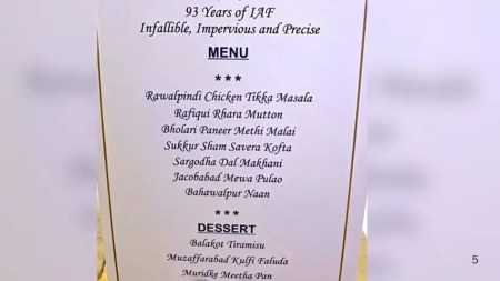 मेनू का टाइटल ही था – "93 Years of IAF: Infallible, Impervious and Precise"। मुख्य कोर्स में शामिल थे 'रावलपिंडी चिकन टिक्का मसाला', 'रफ़ीकी रहरा मटन', 'भोलारी पनीर मेथी मलाई', 'सुक्कुर शाम सवेरा कोफ्ता', 'सरगोधा दाल मखनी', 'जकोबाबाद मेवा पुलाव' और 'बहावलपुर नान'। मिठाइयों ने भी कमाल कर दिया – 'बालाकोट तिरामिसु', 'मुजफ्फराबाद कुल्फी फालूदा' और 'मुरीदके मीठा पान'।