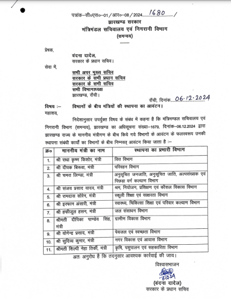 संजय प्रसाद यादव को नियोजन, श्रम, प्रशिक्षण एवं कौशल और उद्योग विभाग दिए गए हैं। रामदास सोरेन स्कूली शिक्षा एवं साक्षरता विभाग और निबंधन विभाग के मंत्री बनाए गए हैं। योगेंद्र प्रसाद को पेयजल एवं स्वच्छता और उत्पाद एवं मद्य निषेध विभाग आवंटित किया गया है। शिल्पी नेहा तिर्की को कृषि, पशुपालन एवं सहकारिता विभाग की जिम्मेदारी सौंपी गई है। इनके अलावा जो विभाग किसी मंत्री को आवंटित नहीं किए गए हैं, वे CM के पास रहेंगे। विभागों के बंटवारे की अधिसूचना सरकार की प्रधान सचिव वंदना डाडेल के हस्ताक्षर से जारी की गई है।