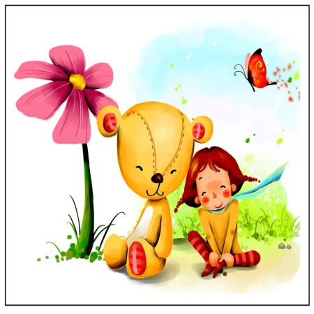 एक छोटी लडक़ी और उसका पीला टेडी बियर एक सुंदर घास के मैदान में खेल रहे थे। टेडी बियर ने एक बड़ा गुलाबी फूल पकड़ा हुआ था, जो हवा में हल्के से झूल रहा था। लडक़ी अपने टेडी के साथ खुशी से मुस्करा रही थी। पास में एक छोटी सी लाल तितली उड़ रही थी, जो उनके इस खुशनुमा पल को और भी रंगीन बना रही थी। लडक़ी और टेडी बियर दोनों एक-दूसरे के साथ समय बिता रहे थे, प्रकृति की सुंदरता का आनंद ले रहे थे। यह एक प्यारा और शांतिपूर्ण पल था, जहां दोस्ती और खुशी का संगम था। लड़की का टेडी बियर उसके लिए एक सच्चा साथी था और वे साथ में हरपल को खास बनाते थे।