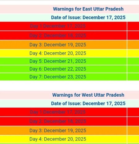 18 दिसंबर – पूर्वी व पश्चिमी यूपी में घना कोहरा छाया रहेगा। विजिबिलिटी घटकर 50 मीटर तक पहुंच सकती है। ठंडी हवाओं के कारण गलन बनी रहेगी। 19 दिसंबर – पश्चिमी यूपी में हल्के कोहरे की संभावना है। वहीं पूर्वी यूपी में अत्यधिक कोहरा देखने को मिल सकता है। दृश्यता शून्य से 100 मीटर तक रह सकती है। 20 दिसंबर – पूर्वी और पश्चिमी यूपी में कोहरे का असर जारी रहेगा। विजिबिलिटी 0 से 100 मीटर के बीच रह सकती है। कुछ इलाकों में बादल भी नजर आ सकते हैं।