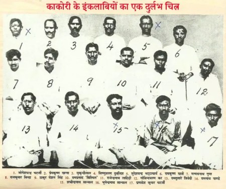 Ram Prasad Bismil : काकोरी कांड को जोगेशचन्द्र चटर्जी, प्रेमकृष्ण खन्ना, मुकुन्दी लाल, विष्णुशरण दुबलिश, सुरेशचन्द्र भट्टाचार्य, रामकृष्ण खत्री, मन्मथनाथ गुप्त, राजकुमार सिन्हा, ठाकुर रोशन सिंह, रामप्रसाद 'बिस्मिल', राजेन्द्रनाथ लाहिड़ी, गोविन्दचरण कर, रामदुलारे त्रिवेदी, रामनाथ पाण्डे, शचीन्द्रनाथ सान्याल, भूपेन्द्रनाथ सान्याल, और प्रणवेश कुमार चटर्जी ने मिलकर अंजाम दिया। उनपर कई धाराओं के तहत मुकदमा दर्ज किया गया। नीचे की फोटो में अशफाउल्ला खान (Ashfaqulla Khan) की तस्वीर नहीं है।
