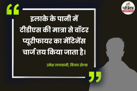 जयपुर के मानसरोवर में विजय सेल्स के प्रॉपराइटर उमेश ललवानी ने वर्ष 2002 में वॉटर प्यूरीफायर बेचना शूरू किया था। वह तब एक कंपनी में काम करते थे और उनका टार्गेट हर महीने 8 वॉटर प्यूरीफायर बेचने का था। उमेश ललवानी ने विजय सेल्स की एजेंसी ले रखी है। उन्होंने पत्रिका से बताया कि वह हर महीने 100-150 वॉटर प्यूरीफायर बेचते हैं। वह वॉटर प्यूरीफायर के सालाना मेंटिनेंस के बारे में बताते हैं कि यह इलाकों के हिसाब से अलग-अलग बैठता है। जयपुर के मानसरोवर इलाके में वॉटर प्यूरीफायर की एएमसी 2700 रुपये है जबकि जगतपुरा में 3500 रुपये सालाना है। ऐसा क्यों? इस सवाल के जवाब में कहते हैं- 'मानसरोवर में पानी में टीडीएस की मात्रा कम है जबकि जगतपुरा में बहुत ज्यादा। टीडीएस के हिसाब से सालाना मेंटिनेंस चार्ज किया जाता है।