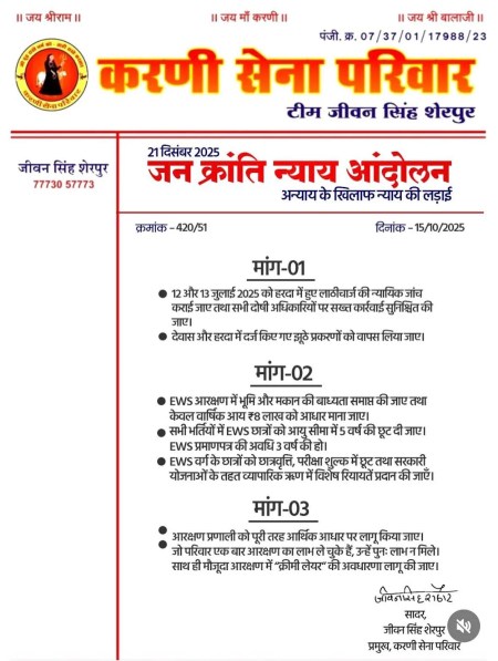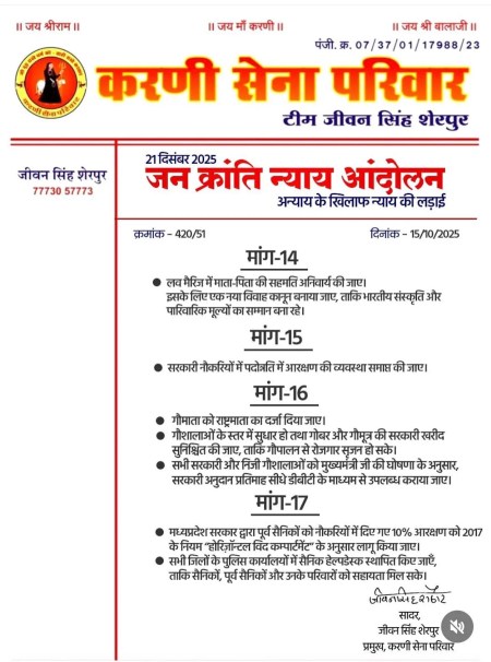 Demand for Parental Permission in Love Marriages Raised: हरियाणा और गुजरात में लव मैरिज के लिए माता-पिता की अनुमति का मामला अब मध्यप्रदेश में करणी सेना उठाने जा रही है। करणी सेना आगामी 21 दिसंबर को हरदा में 21 सूत्रीय मांगों को लेकर जनक्रांति न्याय आंदोलन करने जा रही है। करणी सेना परिवार के राष्ट्रीय अध्यक्ष जीवन सिंह शेरपुर ने patrika.com से खास बातचीत की।