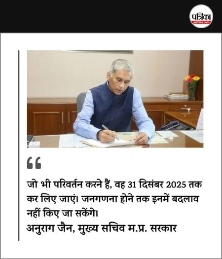 बीते दिनों मुख्य सचिव अनुराग जैन ने सभी विभाग अध्यक्षों की बैठल ली थी। जिसमें उन्होंने निर्देश दिए थे कि जो परिवर्तन किए जाने हैं वह 31 दिसंबर 2025 तक कर लिए जाएं। प्रशासनिक सीमाएं और इकाइयों को फ्रीज कर लिया जाएगा और जनगणना तक कोई बदलाव नहीं किए जाएंगे।