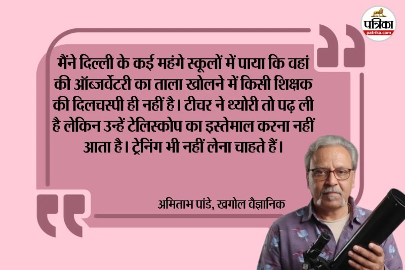 साधन के अभाव में बच्चे खगोल विज्ञान या विज्ञान की पढ़ाई कैसे करेंगे? इस सवाल के जवाब में खगोल विज्ञान के एक्सपर्ट और स्टारस्केप्स एक्सपीरिएंशेज (Starscapes Experiences) के मेंटर अमिताभ पांडे ने पत्रिका से बातचीत में बताया कि आज से 20 से 25 वर्ष पहले दूरबीन की उपलब्धता बहुत मुश्किल है। मैं दिल्ली के स्कूलों में जाकर बच्चों को दूरबीन बनाना सिखाता था, लेकिन आज जो सबसे बड़ी दिक्कत है, वह यह कि स्कूलों में अच्छे और प्रशिक्षित शिक्षकों की कमी का होना। इसके चलते छात्र-छात्राओं में विज्ञान के प्रति दिलचस्पी कम होती जाती है।