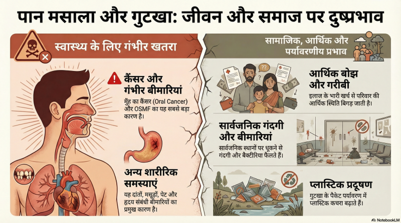 अगर भारत की बात की जाए भारत में पान, पान मसाला और गुटखा जैसे उत्पादों के दुष्प्रभाव कई स्तरों पर देखे जाते हैं, इनमें प्रमुख स्वास्थ्य, सामाजिक, आर्थिक और पर्यावरणीय प्रभाव हैं।