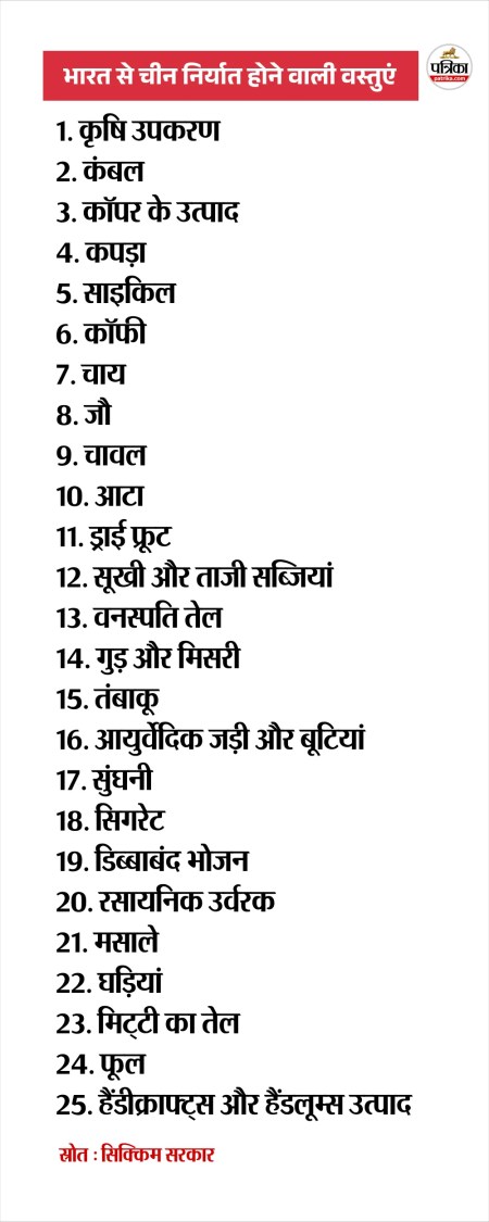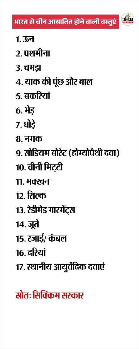 भारत और चीन के बीच नाथुला बॉर्डर को ओल्ड सिल्क रूट कहा जाता है। 2020 में बंद होने से पहले व्यापार का यह रूट साल में छह महीने (मई से नवंबर तक) तक खुला रहता है। इस दर्रे से आयात और निर्यात की जाने वाली वस्तुओं की सूची आप देख सकते हैं।