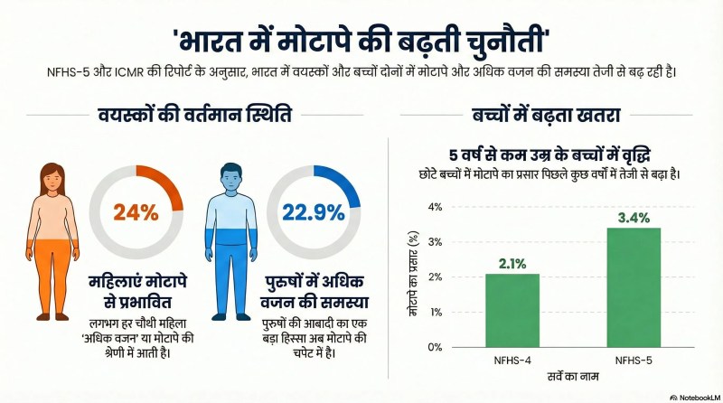 बता दें, राष्ट्रीय परिवार स्वास्थ्य सर्वेक्षण (NFHS-5) और ICMR की रिपोर्ट्स के अनुसार, भारत में लगभग 24% महिलाएं और 22.9% पुरुष अब मोटापे या अधिक वजन (Overweight) की श्रेणी में आते हैं।