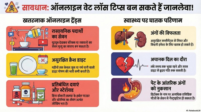 Weight Loss Cause Death : यूट्यूब से लेकर इंस्टाग्राम, फेसबुक जैसे सोशल मीडिया पर वजन घटाने के वीडियो अक्सर देखने को मिल जाते हैं। कई लोग वेट लॉस करने के लिए बताए गए टिप्स को आजमाते भी हैं। इसी साल जनवरी में तमिलनाडु के मदुरै के एक कॉलेज की छात्रा ने यूट्यूब पर बताए गए वजन घटाने के लिए टिप्स को देखकर कुछ चीज का सेवन किया जिसके बाद उसकी मौत हो गई। ये कोई पहला मामला नहीं है। पिछले कुछ सालों से इस तरह के मामले देखने को मिल रहे हैं। जिसके बाद ये सवाल उठता है कि वजन घटाने (Weight Loss) के लिए क्या किया जाए। क्योंकि, एक तरफ मोटापा हमें घेर रहा है तो वहीं, दूसरी ओर इस तरह के मामलों से डर बैठ रहा है।