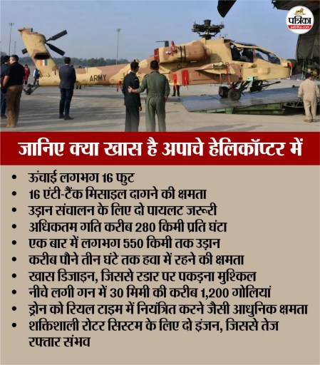 सेना इन अपाचे हेलिकॉप्टरों को पश्चिमी सीमा पर अपनी अटैक एविएशन रणनीति का मुख्य आधार बना रही है, जहां रेगिस्तानी इलाकों में इनकी भूमिका बेहद अहम मानी जा रही है।