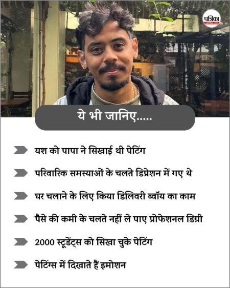 यश ने बताया कि जब मैं 12-13 साल का था, तभी माता-पिता अलग हो गए थे। पिता पेंटिंग करते थे, तो बचपन में उनसे आर्ट सीखी थी। स्कूल के समय भी कई प्रतियोगिताओं में भाग लिया था, लेकिन कला को अपना प्रोफेशन बनाऊंगा ऐसा विचार नहीं किया था। यश ने बताया कि जब डिप्रेशन में गया, तो इसी कला ने मुझे उबारा, तब मैंने इसे ही आगे बढ़ाने का निश्चय किया। पैसे नहीं थे, तो आर्ट की कोई प्रोफेशनल डिग्री नहीं ली है।
