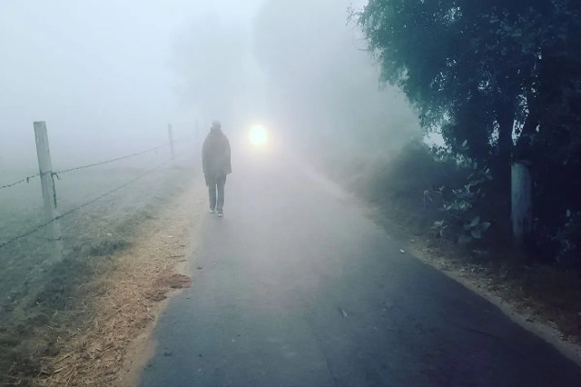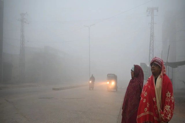 भरतपुर में सर्कुलर रोड़ स्थित चांदपोल गेट के समीप सुबह आठ बजे तेज कोहरे के दौरान वाहन की प्रतिक्षा करती महिलाएं। फोटो— विनोद शर्मा
