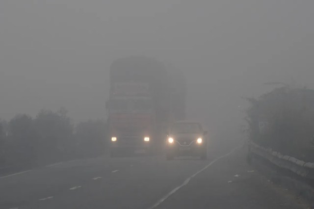 धौलपुर में सुबह 9 बजे छाए घने कोहरे के दौरान नेशनल हाइवे 44 आगरा मुम्बई मार्ग से गुजरते वाहन। फोटो— नरेश लवानियां