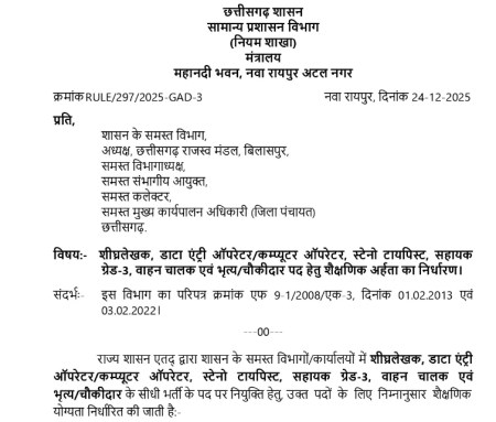 CG Govt Job: राज्य सरकार ने सभी विभागों कार्यालयों में शीघ्रलेखक, डाटा एंट्री ऑपरेटर/ कम्प्यूटर ऑपरेटर, स्टेनो टायपिस्ट और सहायक ग्रेड-3 के पदों पर भर्ती के लिए अब 12वीं पास होना जरूरी है। राज्य सरकार ने इन पदों के लिए न्यूनतम योग्यता के नए मापदंड तय किए हैं। दूसरी तरफ, अब सरकारी गाड़ियों के लिए ड्राइवर और चपरासी/चौकीदार बनने के लिए आठवीं पास होना जरूरी है। सरकार ने सीधी भर्ती के जरिए होने वाली नियुक्ति के लिए यह योग्यता तय की है। पहले पांचवीं पास की भी ड्राइवर के रूप में भर्ती हो जाती थी।