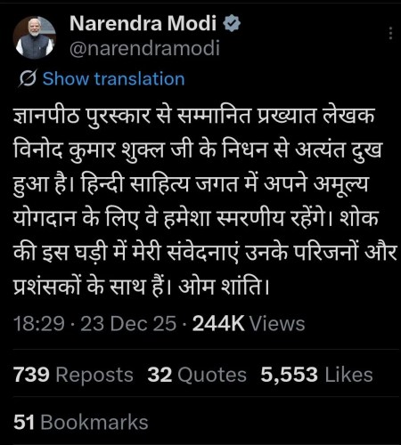 मुख्यमंत्री ने दिवंगत साहित्यकार के परिजनों के प्रति गहरी संवेदना व्यक्त करते हुए कहा कि इस दुख की घड़ी में पूरा प्रदेश उनके साथ खड़ा है। उन्होंने यह भी कहा कि विनोद कुमार शुक्ल अपने विचारों, शब्दों और संवेदनाओं के माध्यम से हमेशा हमारे बीच जीवित रहेंगे। राज्य के साहित्य, कला और संस्कृति से जुड़े अनेक लोगों ने भी उनके निधन पर शोक व्यक्त किया है।