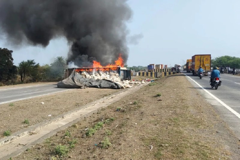 टायर फटने से चालक वाहन पर नियंत्रण नहीं रख सका और ट्रक असंतुलित होकर सडक़ किनारे पलट गया। ट्रक के पलटते ही उसके इंजन के हिस्से से चिंगारी निकली और कुछ ही क्षणों में आग भडक़ उठी।