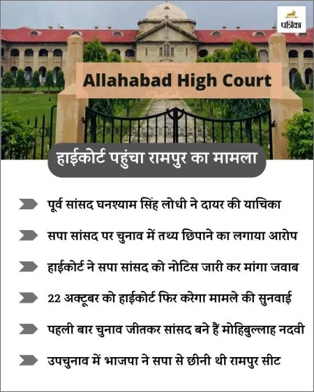 रामपुर से समाजवादी पार्टी के सांसद मोहिबुल्लाह नदवी को उनके निर्वाचन को चुनौती देने वाली याचिका पर जवाब के लिए नोटिस जारी करने का आदेश न्यायमूर्ति चंद्र कुमार राय ने दिया। भाजपा उम्मीदवार रहे घनश्याम लोधी ने हाईकोर्ट में याचिका दायर कर बताया कि सपा सांसद मोहिबुल्लाह नदवी ने अपने नामांकन पत्र में कई जानकारियां छिपाई थीं। इस आधार पर उनका निर्वाचन निरस्त कर दिया जाना चाहिए। इलाहाबाद हाईकोर्ट ने याचिका पर अगली सुनवाई के लिए 21 अक्टूबर की तारीख लगाई है।